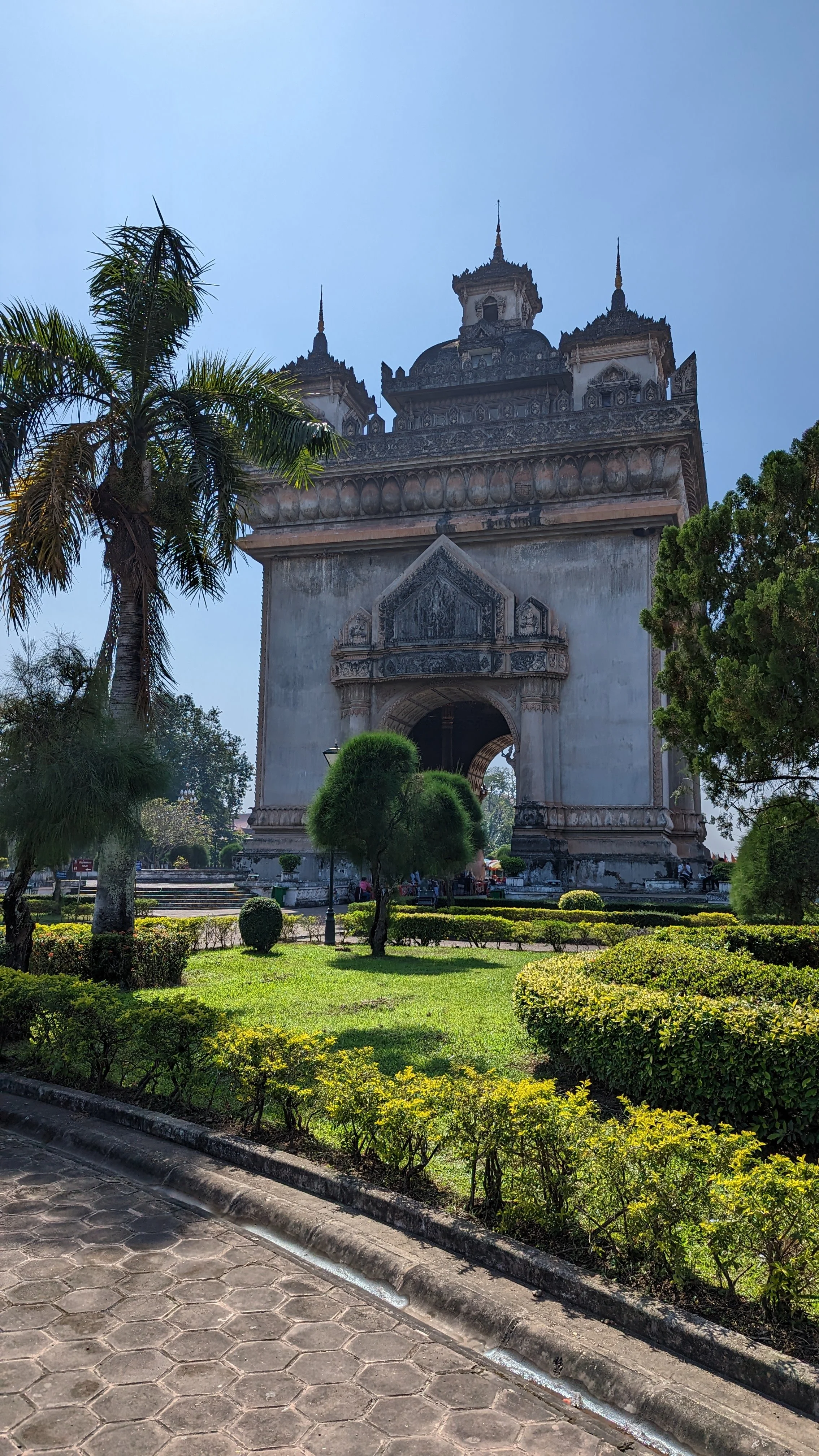 The only thing on our agenda today was to walk to the Patuxay Monument which was only a few blocks away. Back in the 1950s, the US gave Laos money to build an airport. Instead, they decided to build a memorial dedicated to those who fought for independence from France. It was completed in the 1960s and is modeled after the Arc de Triomphe, but with a Lao flare. It’s a pretty cool monument, and G and I got a laugh out of its origin story.